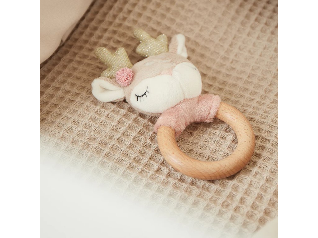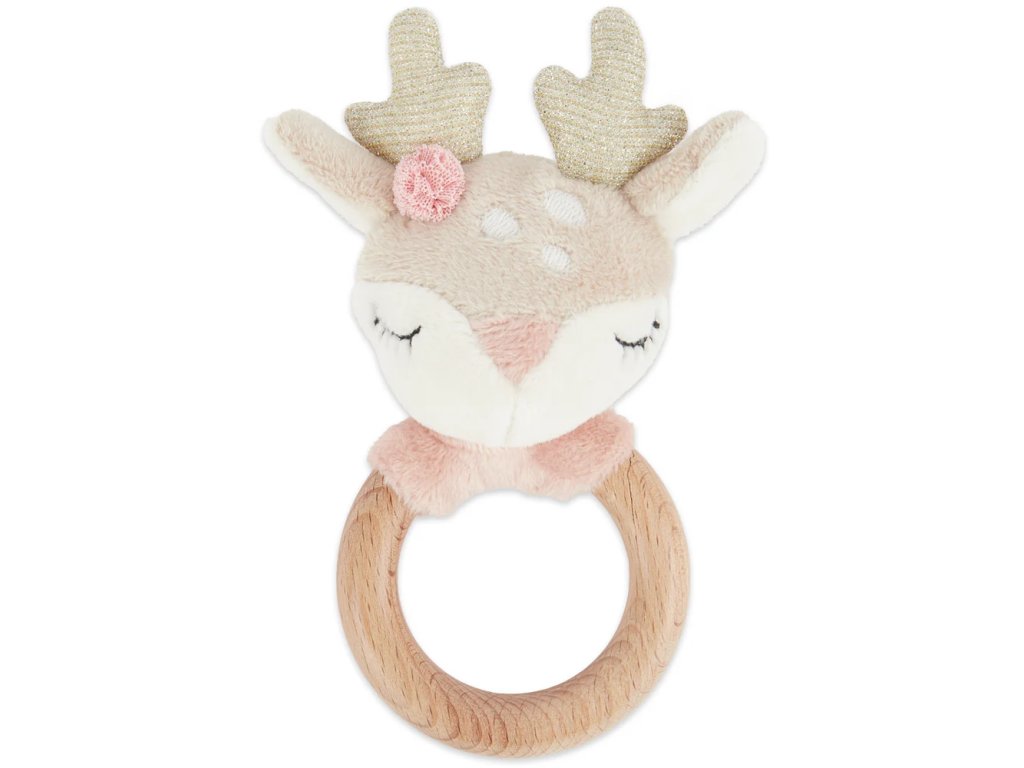 Plyšové chrastítko od Bieco je skvělá hračka pro malé novorozence a má okouzlující roztomilý vzhled. Jelen je chytací hračka, chrastítko a kousátko v jednom, a proto je věrným společníkem v prvních měsících života vašeho dítěte. Přírodní dřevo a měkký plyš jsou příjemné na dotek a zároveň představují zajímavý kontrast, který stimuluje hmat. Dřevěný kroužek posiluje patro vašeho dítěte a pomáhá zmírnit bolest při prořezávání zubů. Když se s jelenem zatřese, vesele chrastí a hravou formou tak podporuje jemnou motoriku a sluch vašeho dítěte. Decentní design dělá z chrastítka stylového společníka, který nadchne rodiče i děti.