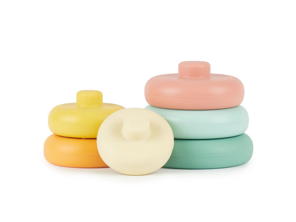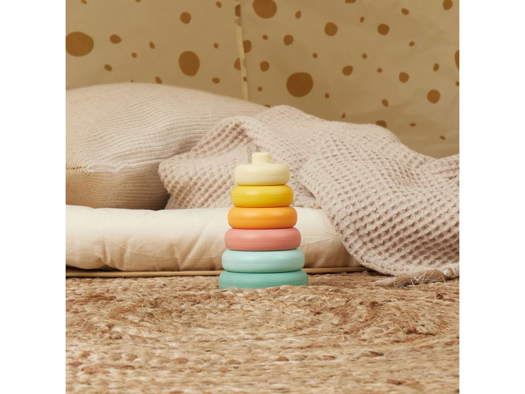 6dílná stohovatelná sada ze 100% silikonu. Perfektní vzdělávací hračka pro koordinaci a jemnou motoriku, rozpoznávání barev a koupání. Silikon je odolný a nerozbitný a snadno se čistí vodou a jemným mýdlem.