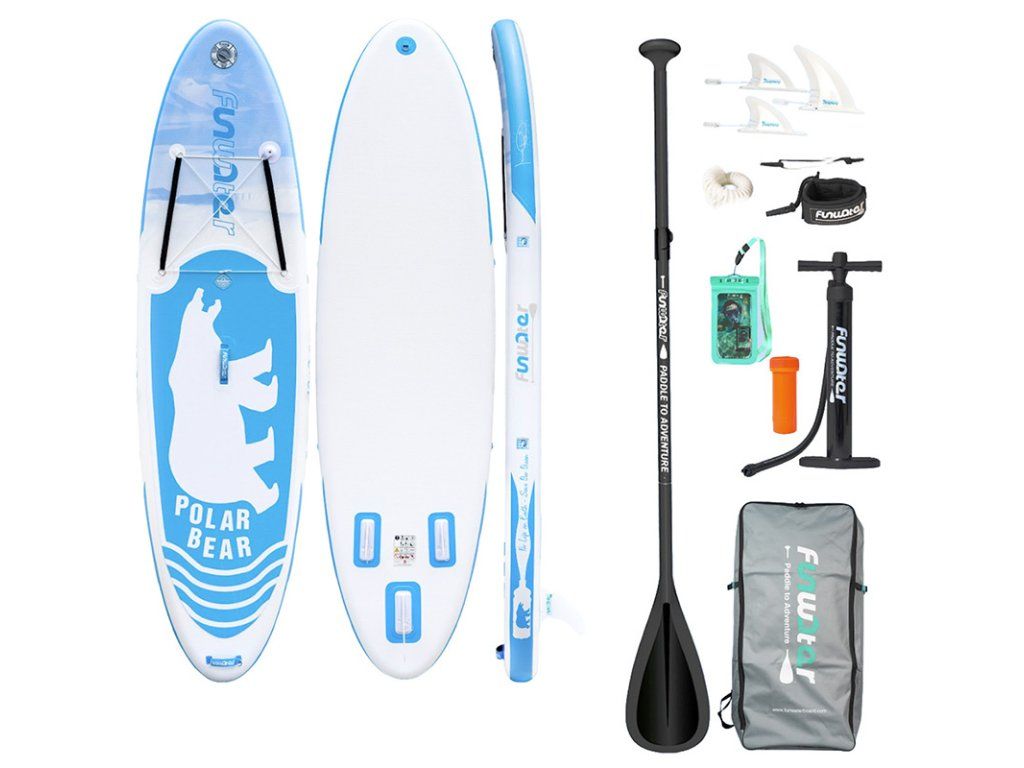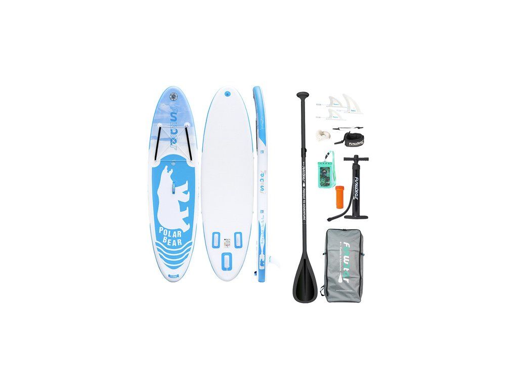FunWater SUP board Funwater SUP board je univerzální nafukovací paddleboard, který kombinuje stabilitu, pohodlí a všestrannost. Je vybaven odnímatelnými ploutvemi pro lepší manévrovatelnost, protiskluzovým povrchem EVA a sadou příslušenství, takže je vhodný jak pro začátečníky, tak pro zkušenější uživatele. Tento model je vhodný pro jezera, řeky i moře. Stabilita a kontrola na vodě Deska byla navržena pro dobrou rovnováhu a hladké ovládání. Odnímatelné ploutve zvyšují stabilitu, zlepšují směrovost a umožňují efektivnější manévrování, což se promítá do větší kontroly při pádlování. Díky tomu je deska vhodná pro různé podmínky, od klidných jezer po náročnější vody. Pohodlný a bezpečný povrch Deska je pokryta protiskluzovou EVA pěnou, která zajišťuje bezpečný došlap i na mokrém povrchu. Reliéfní struktura zvyšuje trakci a snižuje riziko uklouznutí při změně polohy nebo při cvičení, jako je jóga. Toto řešení ocení také ti, kteří plavou s dětmi nebo domácími mazlíčky. Promyšlené detaily pro snadné použití Ergonomická rukojeť usnadňuje přenášení desky a vytahování z vody. Vestavěný tlakoměr umožňuje průběžně sledovat úroveň nahuštění – doporučený tlak je mezi 12 a 15 PSI, což pomáhá udržovat optimální tuhost a výkon na vodě. Flexibilní popruhy umožňují bezpečně připevnit batoh nebo jiné příslušenství a další D-kroužek umožňuje připevnit kajakové sedadlo. Součástí balení plavecká deskabatoh na uloženísada ploutvíbezpečnostní poutkopumpavodotěsné pouzdro na telefonsada na opravu3dílné pádločelenkauživatelská příručka VýrobceFunwaterModelSUPFW07ADoporučený tlak12–15 PSIRozměry320 x 83 x 15 cm