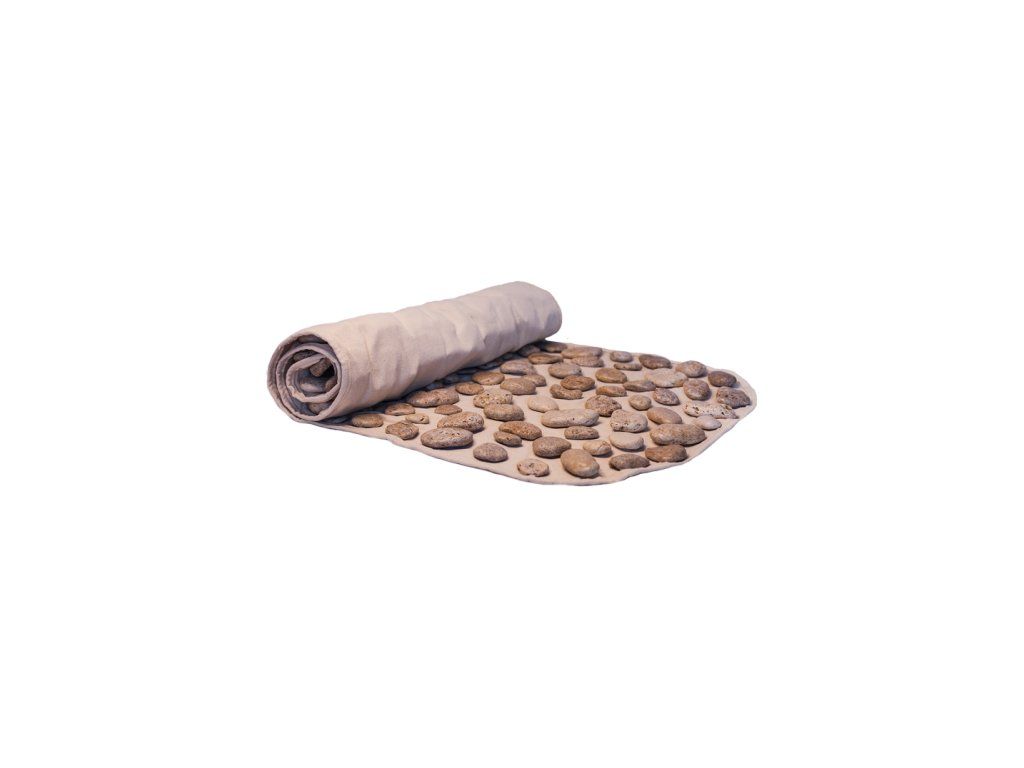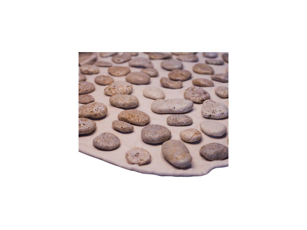 Masážní podložka je vyhotovena s použitím přírodních oblázků z Černého moře. Základem podložky je přírodní lněný textil, lepidlo je bez zápachu, není toxický, kamínky drží pevně.