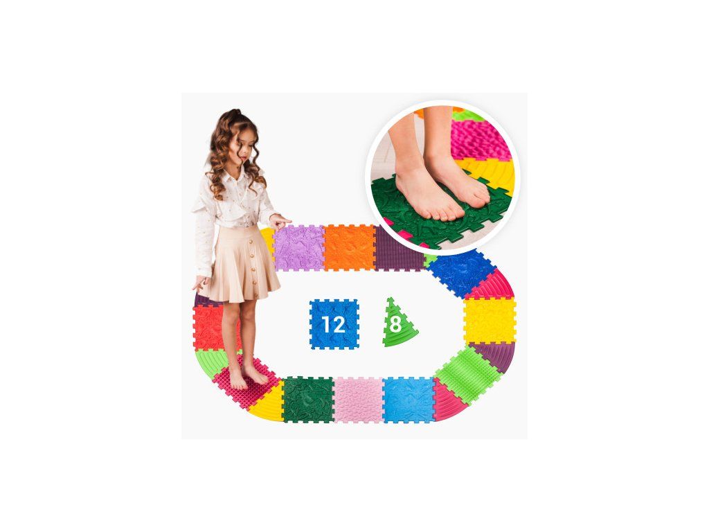 podporuje správný vývoj dětských nohou; zlepšuje svalový tonus posilováním podélné a příčné klenby chodidla; účinně zlepšuje krevní oběh; uvolňuje napětí v chodidlech působením na nervová zakončení.Sady s trojúhelníkovými rohovými puzzly umožňují vytvářet vlnité dráhy, kruhy a vzory z běžných čtvercových skládaček. Tímto způsobem můžete vytvářet dráhy kolem kusů nábytku, rohů, šetřit místo v místnosti a hlavně - rozvíjet fantazii a zájem dětí o činnosti na podložkách.