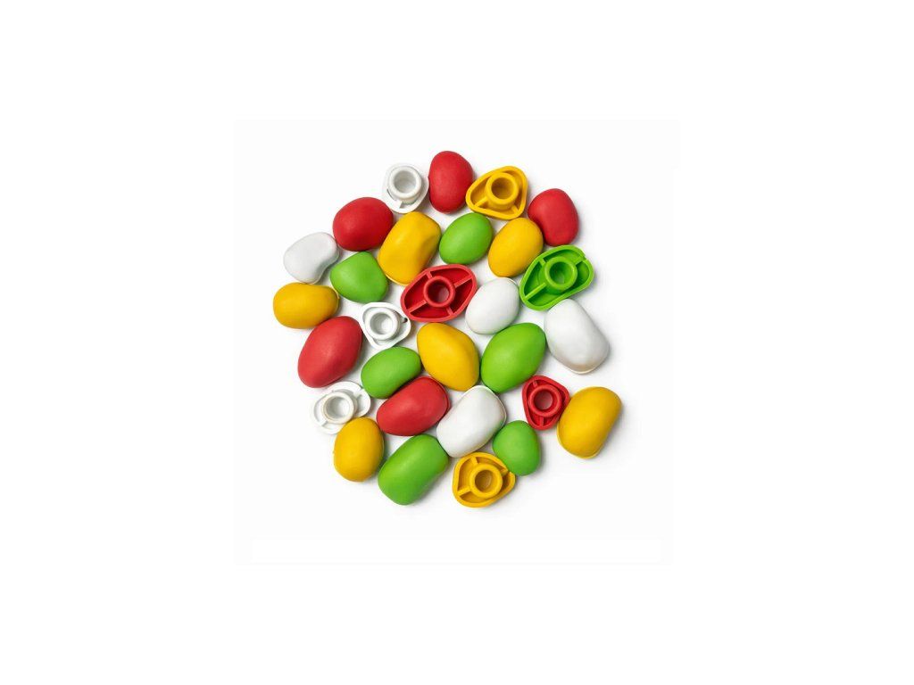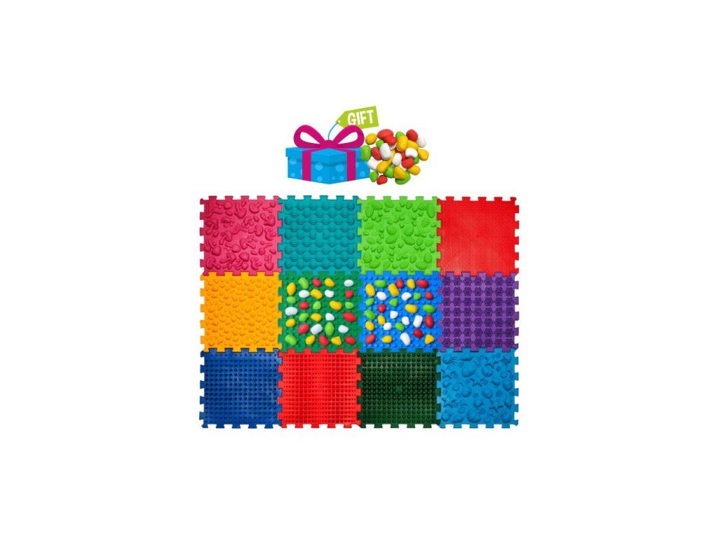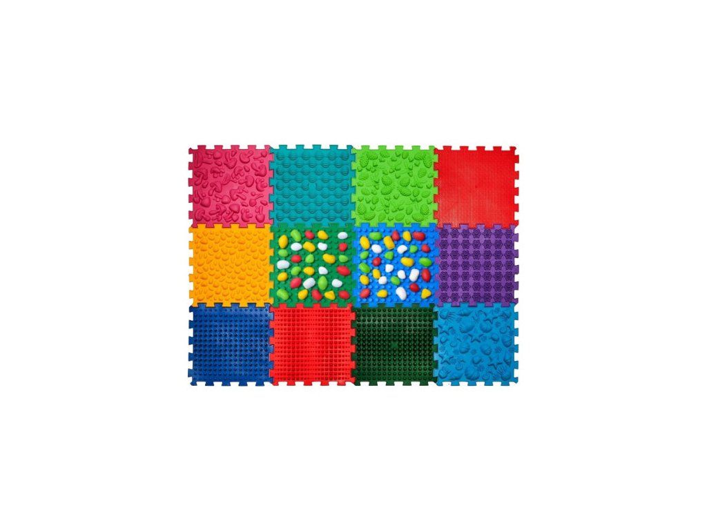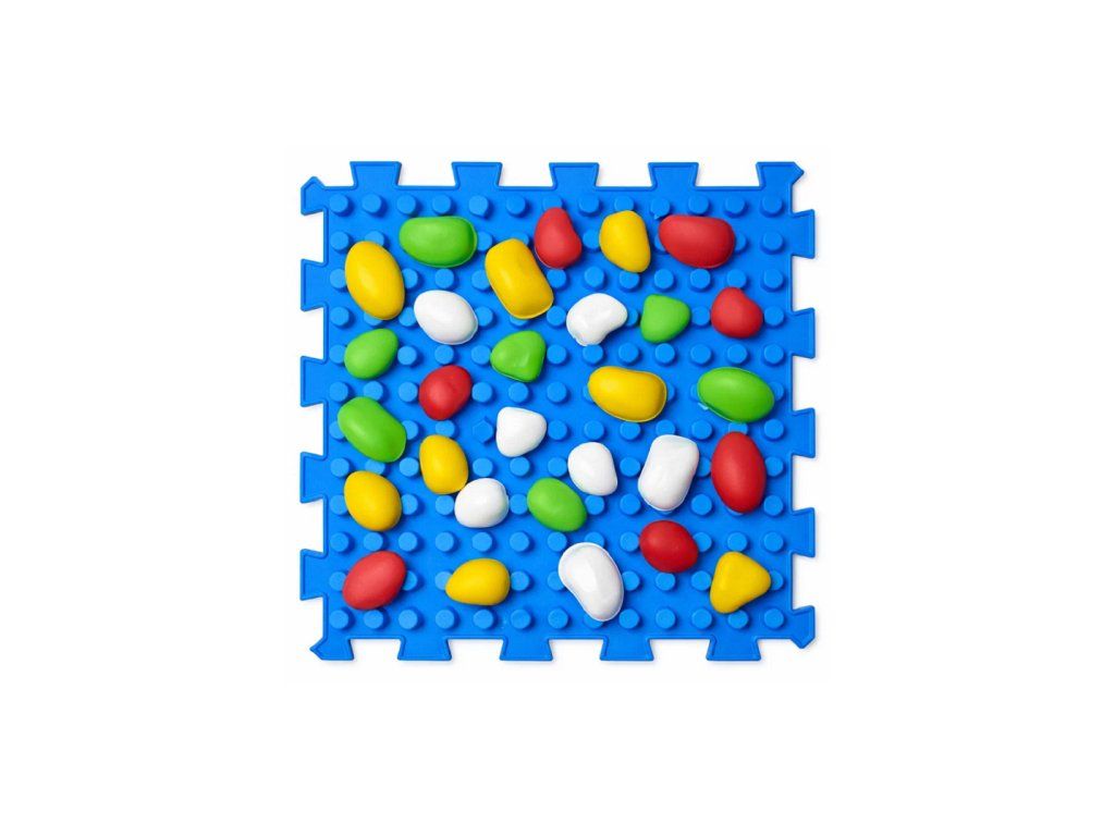Masážní podložka se skládá z 12 puzzlí a 28 modulů Kamínky. Je vyrobena z hygienického, hypoalergenního materiálu na bázi PVC. Kamínky jsou barevné, mají různé tvary a velikosti (2–5 cm). Vytvářejí realistickou, přitom lehkou a hravou imitaci mořských oblázků. Kamínky stimulují chodidla i dlaně a podporují senzorický rozvoj. Drobné prvky a úkoly typu „přesuň – připevni – stiskni“ rozvíjejí jemnou motoriku: prsty se stávají obratnějšími, zlepšuje se koordinace a síla úchopu. Dítě může barevné kamínky skládat na puzzle, třídit je podle barev, libovolně je rozmisťovat nebo z nich vytvářet obrazce jako z mozaiky. Díly na puzzlích dobře drží, takže je možné po podložce bezpečně chodit a masírovat chodidla. Rozměr modulu: 26 x 26 cm