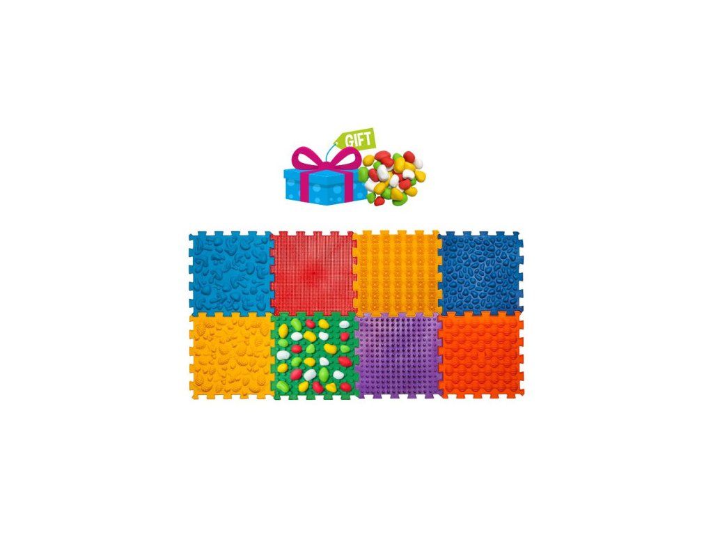 Masážní podložka se skládá z 8 puzzlí a 28 modulů Kamínky. Je vyrobena z hygienického, hypoalergenního materiálu na bázi PVC. Kamínky jsou barevné, mají různé tvary a velikosti (2–5 cm). Vytvářejí realistickou, přitom lehkou a hravou imitaci mořských oblázků. Kamínky stimulují chodidla i dlaně a podporují senzorický rozvoj. Drobné prvky a úkoly typu „přesuň – připevni – stiskni“ rozvíjejí jemnou motoriku: prsty se stávají obratnějšími, zlepšuje se koordinace a síla úchopu. Dítě může barevné kamínky skládat na puzzle, třídit je podle barev, libovolně je rozmisťovat nebo z nich vytvářet obrazce jako z mozaiky. Díly na puzzlích dobře drží, takže je možné po podložce bezpečně chodit a masírovat chodidla. Rozměr modulu: 26 x 26 cm