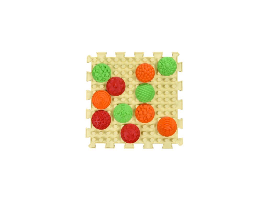Tato podložka spojuje v jednom produktu masáž chodidel, trénink rovnováhy, rozvoj jemné motoriky i hravé objevování. Tento set se stane užitečným a současně i zajímavým dárkem. Masážní podložka se skládá ze čtyř puzzlí typu Plástve a 48 modulů, které se upevňují na základní podložku. Je vyrobena z hygienického, hypoalergenního materiálu na bázi PVC. Dvanáct druhů vzorů má rozdílnou strukturu povrchu, která rozvíjí hmatové vnímání a vytváří rozmanité masážní efekty. Díly lze připevnit jak na vystouplé „sloupky“ puzzle, tak i do prostoru mezi nimi. Dítě může na podložce vytvářet barevné vzory, třídit díly podle barvy, skládat je v libovolném pořadí nebo z nich poskládat obrazec jako mozaiku. Díly pevně drží, takže po nich lze bezpečně chodit a zároveň jemně masírovat chodidla. Rozměr puzzle: 26 × 26 cm. Průměr jednoho modulu je 5 cm. Co dokáže masážní podložka se senzorickými moduly: podporuje správné formování dětského chodidla; pomáhá zpevňovat svaly a posiluje podélnou i příčnou klenbu; rozvíjí jemnou motoriku a smyslové vnímání; trénuje rovnováhu a koordinaci pohybů. Použití: prevence plochých nohou, šmajdání, vbočených kotníků a dalších poruch nohou; rozvoj senzorického vnímání a zdokonalení jemné motoriky; úleva při pocitu unavených a těžkých nohou. Sada doporučených cviků: Chůze po podložce vpřed a vzad (30–40 sekund). Výchozí poloha – ve stoje, stoupání na špičky (7–9×). Ve stoje – přenášení váhy z paty na špičku (30–40 sekund). Chůze po podložce s překřížením nohou (30–40 sekund). Chůze po vnitřní straně chodidel (30–40 sekund). Chůze po vnější straně chodidel (30–40 sekund). Chůze po špičkách (30–60 sekund). Dřepy s oporou celé nohy, bez zvedání pat z podložky (7–9×). Stoj – udržení rovnováhy nejprve na jedné, poté na druhé noze (20–30 sekund). Skoky z jednoho dílu na druhý (7–9×). Skoky nejprve na jedné, poté na druhé noze (6–8×). Poloha v polosedu – chůze po podložce (20–30 sekund). Takto vypadá kompletní cvičení na masážní podložce Ortek. Po rozložení puzzlí stačí spustit video a dítě může bezpečně cvičit podle doporučené sestavy. Cvičit se doporučuje třikrát až pětkrát týdně. Už po měsíci si můžete všimnout prvních výsledků cvičení u dítěte, jeho svaly se zpevní a chůze bude jistější. Všechny díly puzzle jsou vyrobeny ze stejného materiálu, který je bezpečný, hypoalergenní a neobsahuje žádné škodlivé příměsi. Kontraindikace: otevřené rány nebo zánětlivá onemocnění kůže chodidel; syndrom diabetické nohy. K dispozici je také varianta podložky se šesti díly a 72 moduly. Složení sady a barevné provedení se mohou mírně lišit od vyobrazení na webových stránkách.Země původu: Ukrajina