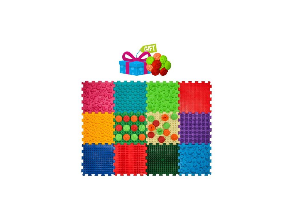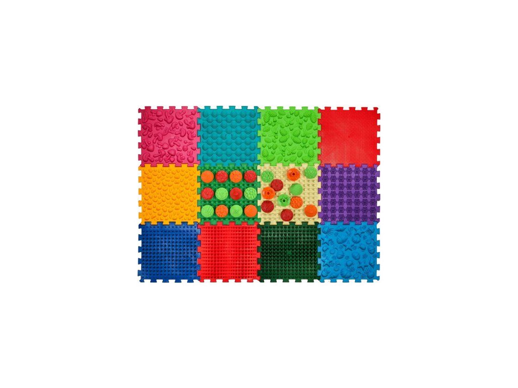 Masážní podložka obsahuje 12 puzzle dílů a navíc 24 modulů Vzory jako dárek. Je vyrobena z hygienického, zdravotně nezávadného a hypoalergenního materiálu na bázi PVC. Dvanáct různých vzorů má odlišnou povrchovou strukturu, která podporuje rozvoj taktilního vnímání a vytváří rozdílný masážní efekt. Jednotlivé díly se upevňují na vystouplé „kolíčky“ puzzle. Dítě může na puzzle skládat barevné vzory, třídit je podle barev, ukládat je v libovolném pořadí nebo z nich tvořit obrázky podobně jako mozaiku. Díly drží pevně, takže se po nich dá bezpečně chodit a přirozeně masírovat chodidla. Rozměr modulu: 26 x 26 cm Průměr jednoho modulu: 5 cm.