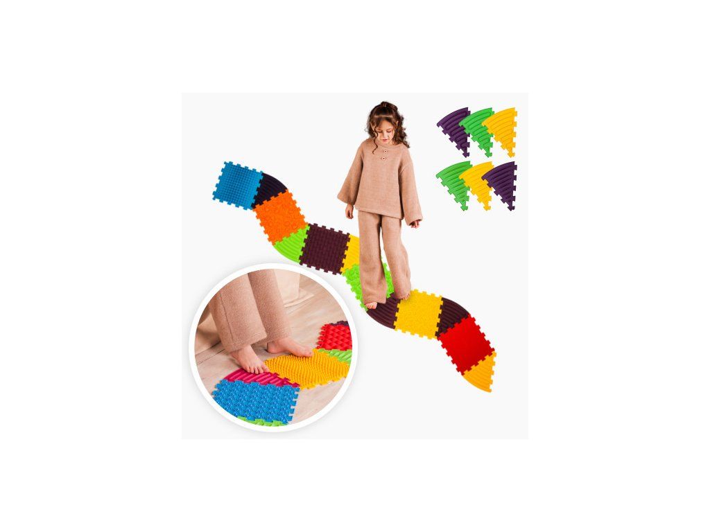podporuje správný vývoj dětských nohou; zlepšuje svalový tonus posilováním podélné a příčné klenby chodidla; účinně zlepšuje krevní oběh; uvolňuje napětí v chodidlech působením na nervová zakončení.Sady s trojúhelníkovými rohovými puzzly umožňují vytvářet vlnité dráhy, kruhy a vzory z běžných čtvercových skládaček. Tímto způsobem můžete vytvářet dráhy kolem kusů nábytku, rohů, šetřit místo v místnosti a hlavně - rozvíjet fantazii a zájem dětí o činnosti na podložkách.