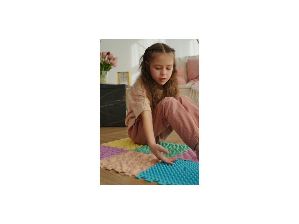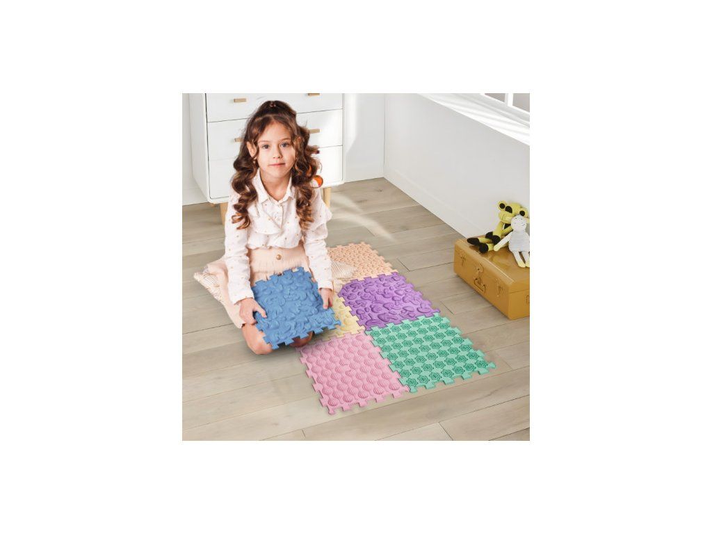 Jemné pastelové barvy krásně zapadají do interiéru, kobereček vypadá esteticky atraktivní a elegantní.Masážní podložka se skládá z 6 puzzlí a je vyrobena z hygienického, hypoalergenního materiálu na bázi PVC.