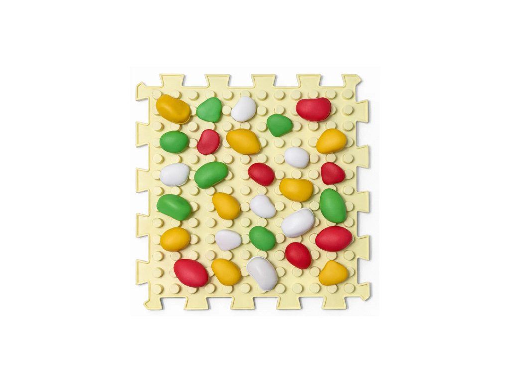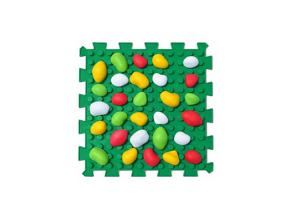 Masáž a posilování chodidel, rozvoj jemné motoriky a hra v jednom výrobku. Masážní podložka se skládá z 1 puzzle Plástve a 28 kamínkových modulů, které se upevňují na základní puzzle. Je vyrobena z hygienického, hypoalergenního materiálu na bázi PVC. Kamínky jsou barevné, mají různé tvary a velikosti (2–5 cm). Vytvářejí realistickou, přitom lehkou a hravou imitaci mořských oblázků. Kamínky stimulují chodidla i dlaně a podporují senzorický rozvoj. Drobné prvky a úkoly typu „přesuň – připevni – stiskni“ rozvíjejí jemnou motoriku: prsty se stávají obratnějšími, zlepšuje se koordinace a síla úchopu. Dítě může barevné kamínky skládat na puzzle, třídit je podle barev, libovolně je rozmisťovat nebo z nich vytvářet obrazce jako z mozaiky. Díly na puzzlích dobře drží, takže je možné po podložce bezpečně chodit a masírovat chodidla. Rozměr modulu: 26 x 26 cm