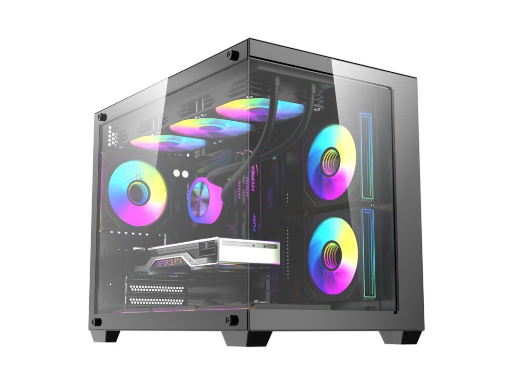 Skříň je vybavena skleněnými panely, které poskytují panoramatický pohled do vnitřku. Díky absenci vertikálního rohového profilu jsou odstraněny vizuální dělení, takže všechny komponenty jsou jasně viditelné zepředu i z boku. Toto řešení funguje obzvláště dobře mimo jiné v herních a streamovacích sestavách – umožňuje zajímavým způsobem předvést vodní chlazení s displejem nebo osvětlené RGB ventilátory.