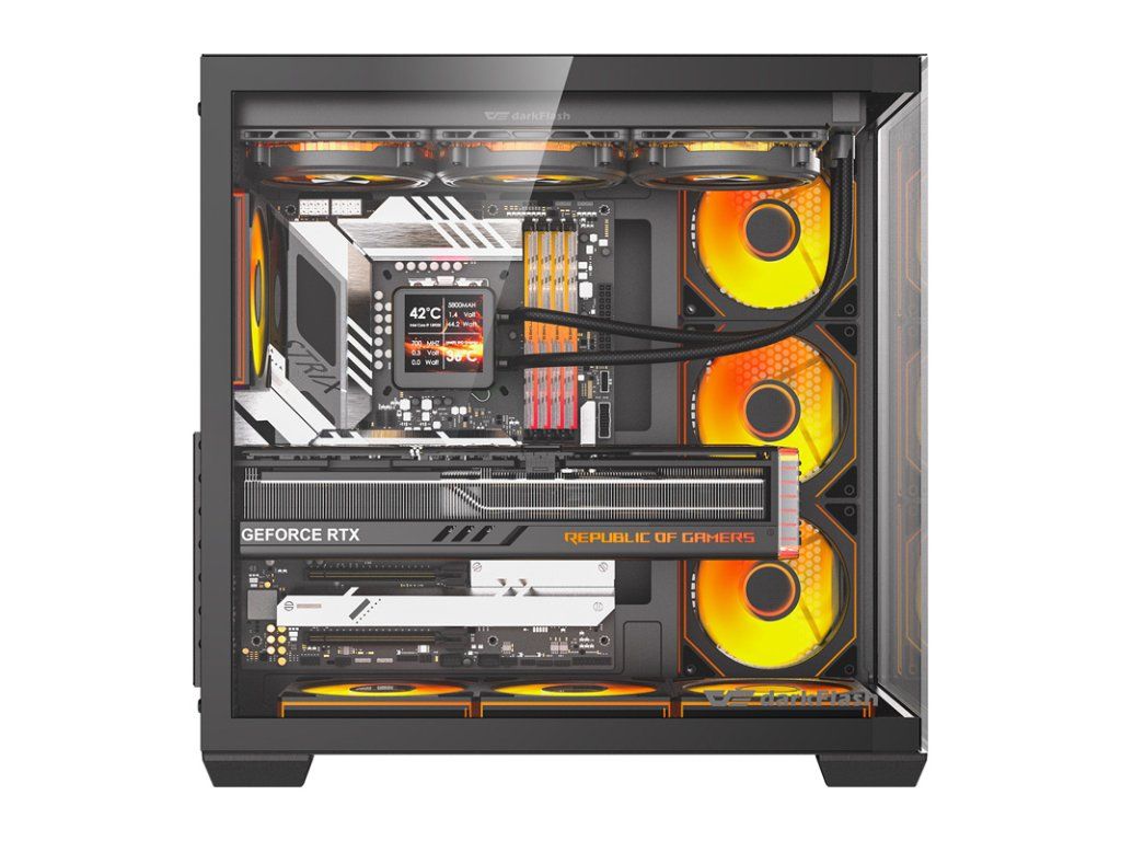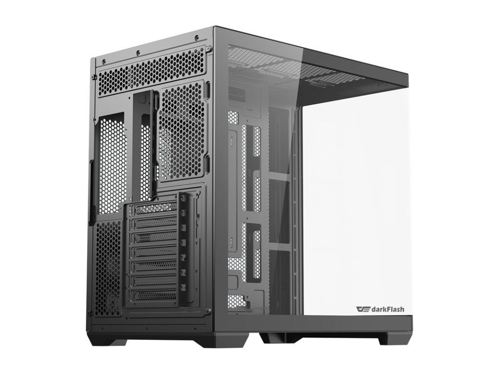 DarkFlash C280 je prostorná počítačová skříň navržená pro komplexní konfigurace a působivé zobrazení komponent. Podporuje základní desky E-ATX, ATX, Micro-ATX a ITX, stejně jako grafické karty o délce až 420 mm a chladiče CPU o výšce až 155 mm. To vám dává velkou svobodu při výběru komponent. Konstrukce o rozměrech 443 × 277 × 426 mm je vyrobena z plechu SPCC a doplněna panely z tvrzeného skla, které zajišťují odolnost a moderní vzhled. Sada obsahuje také 7 ventilátorů, takže se můžete hned od začátku postarat o správný chladicí systém.