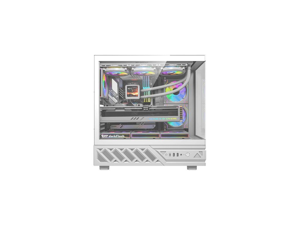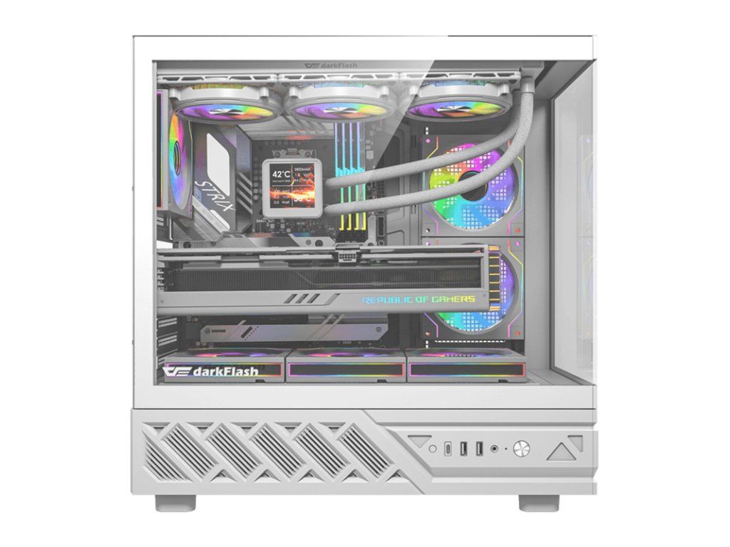 DarkFlash DS950 je počítačová skříň ATX, která vám umožní sestavit výkonnou konfiguraci pro hraní her a další účely. Design nabízí 270° panoramatický výhled, díky čemuž je vnitřek počítače plně viditelný ze dvou stran – můžete tak zajímavým způsobem předvést vybrané komponenty, například ty s RGB osvětlením. K dispozici máte také bohatou sadu portů, včetně USB-C 3.2 Gen 2. Skříň podporuje základní desky ATX, Micro-ATX a ITX a má rozměry 450 × 222 × 465 mm. Je vyrobena z 0,5 mm silného plechu SPCC, který poskytuje stabilní a pevný základ pro pokročilé konfigurace.