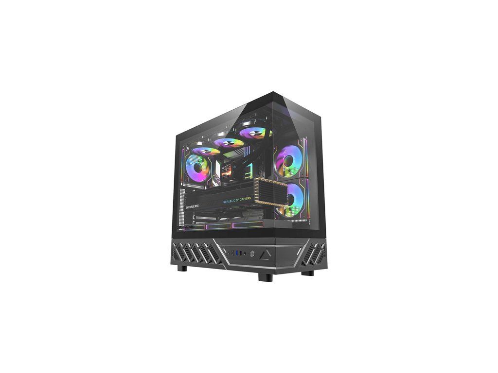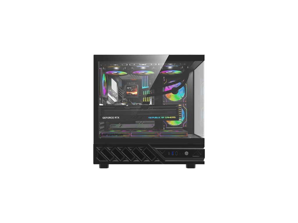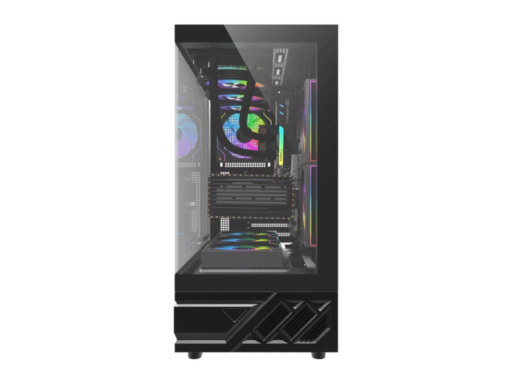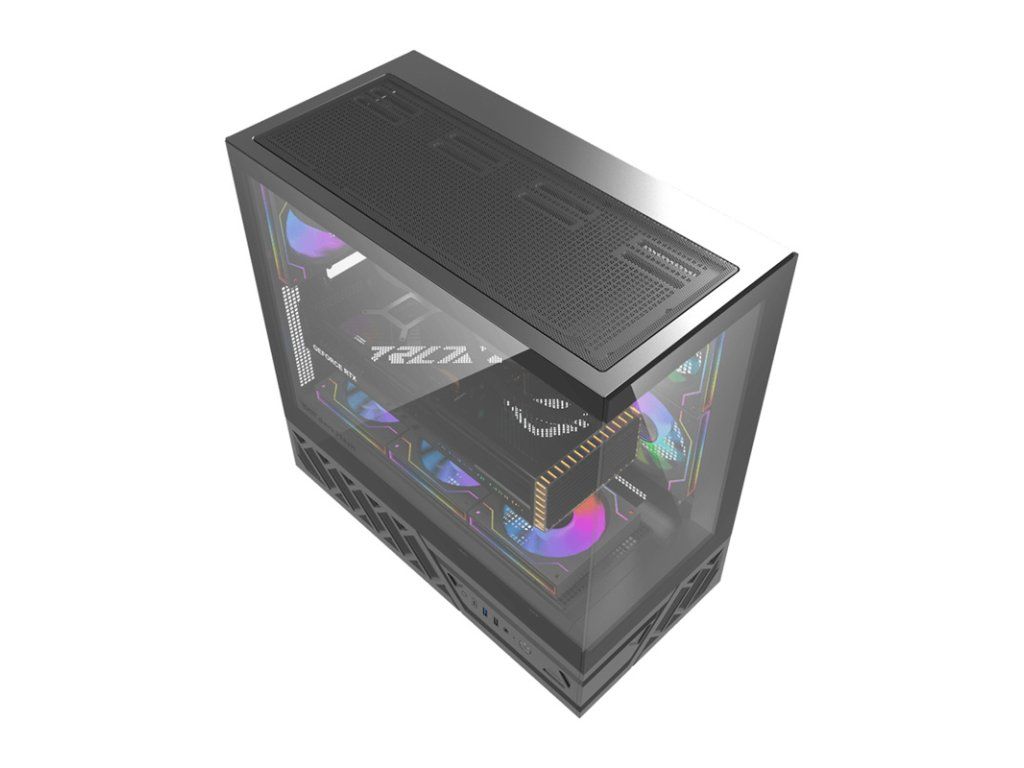 Skříň je vybavena dvěma průhlednými panely bez vertikálního profilu, které poskytují široký výhled na komponenty. Tento design umožňuje zajímavé vizuální efekty – můžete například předvést RGB ventilátory nebo vodní chlazení s displejem. Dejte svému počítači jedinečný charakter!
