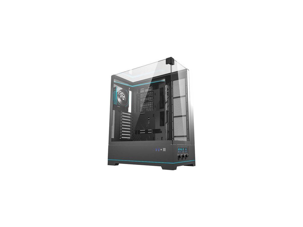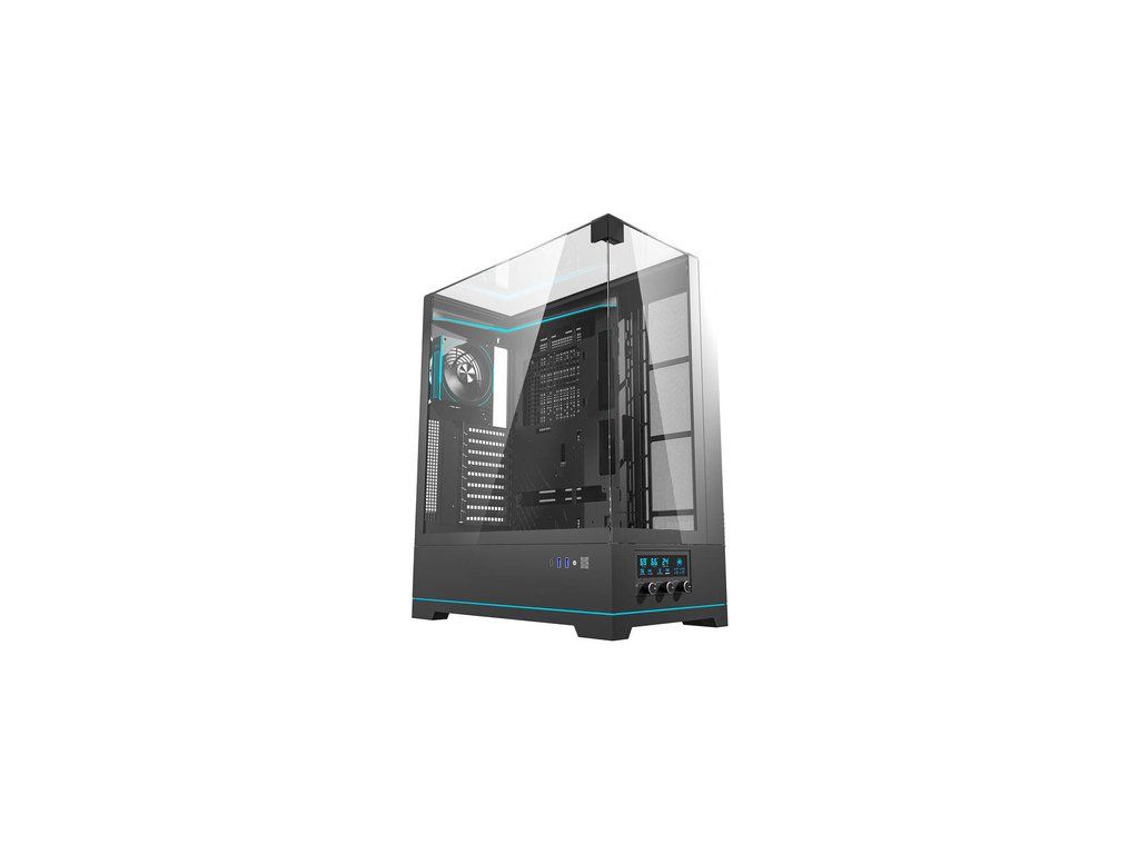 Darkflash DY450L PRO je vybavena digitálním systémem řízení teploty, který zajišťuje monitorování teplot GPU, CPU a vnitřní teploty skříně v reálném čase. Panel s knoflíky na přední straně umožňuje přesné ovládání rychlosti ventilátorů, což umožňuje optimalizovat chlazení podle zatížení systému.