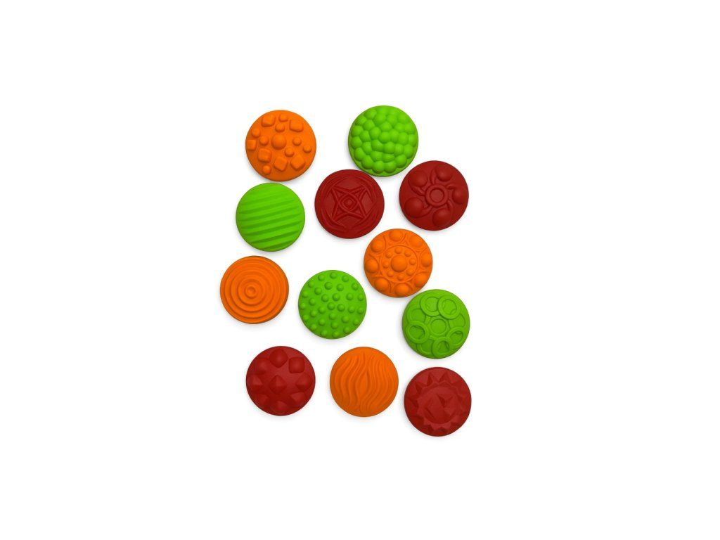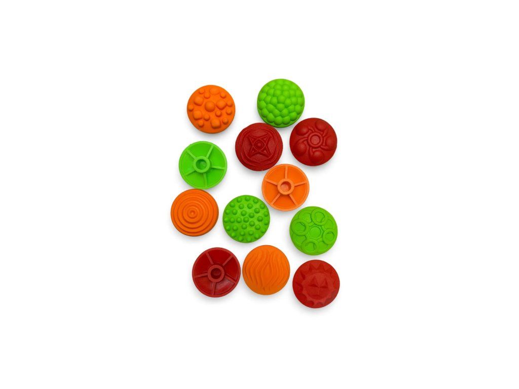 Sada se skládá z 12 modulových dílů, které se upevňují na základní puzzle Plástve. Každý díl má svou jedinečnou texturu a tvar, které různým způsobem stimulují chodidla i dlaně. Když se dítě dotýká hladkých, ostrých nebo zvlněných povrchů, mozek se učí rozlišovat tyto vjemy bez pomoci zraku, což vede k rozvoji senzorické paměti. Drobné prvky a úkoly typu „připevni a stiskni" trénují jemnou motoriku: prstíky se stávají obratnějšími, zlepšuje se koordinace a síla úchopu. Dítě může barevné kamínky skládat na puzzle, třídit je podle barev, libovolně je rozmisťovat nebo z nich vytvářet obrazce jako z mozaiky. Díly na puzzlích dobře drží, takže je možné po podložce bezpečně chodit a masírovat chodidla. Průměr jednoho modulu: 5 cm. Materiál: PVC (bezpečný, bez příměsí)