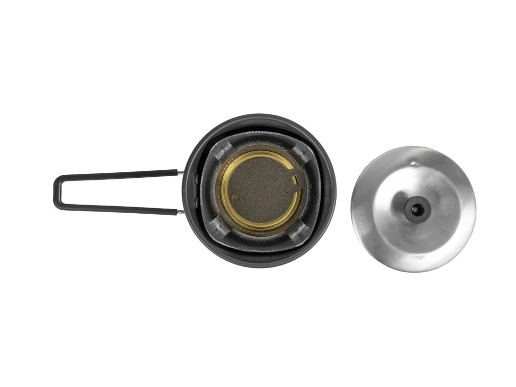 Nádobí je z tvrdě eloxovaného hliníku (Hard Anodized), který je odolný vůči opotřebení, korozi a je extrémně lehoučký. Celý set se dá složit do kompaktního balíčku o velikosti hrníčku, takže se ti perfektně vejde do kapsy batohu nebo bikepackingové brašny.